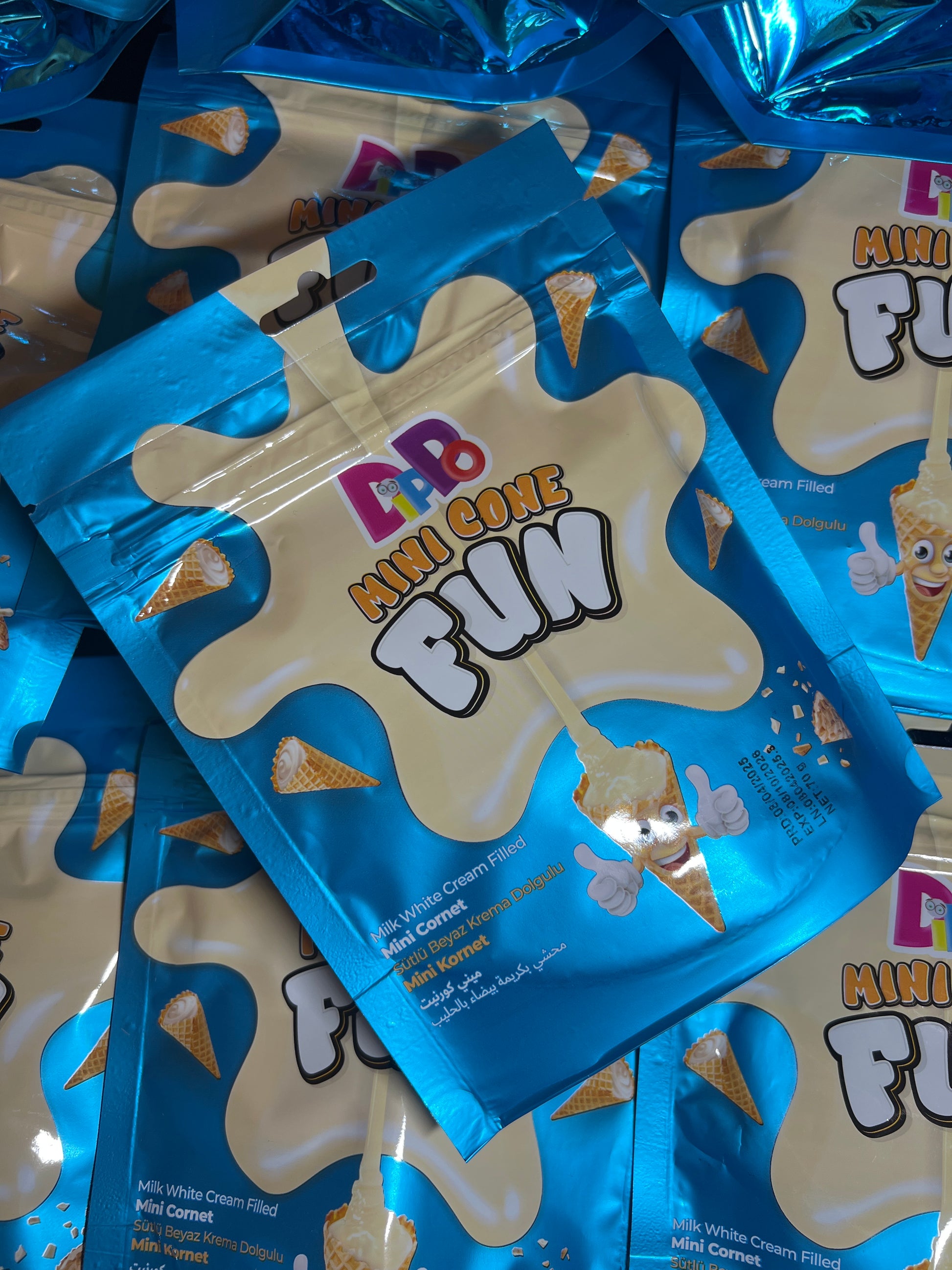 Craque pour les Dippo Mini Cornet chocolat blanc : de délicieux mini-cônes croquants garnis d’une crème onctueuse et recouverts de chocolat blanc fondant.