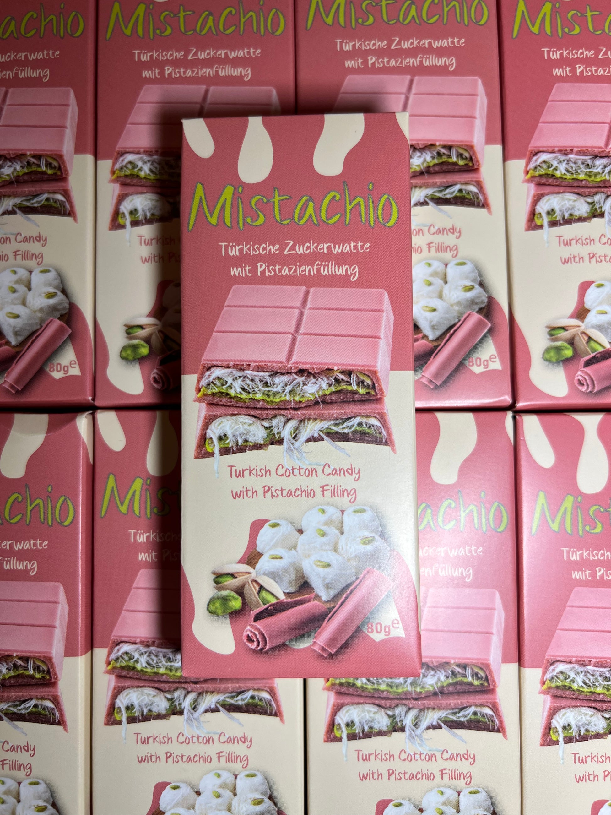 Découvrez la tablette Mistachio Chocolat Ruby & Barbe à papa : une création unique qui associe le goût fruité et légèrement acidulé du chocolat Ruby, la douceur aérienne de la barbe à papa turque, et le croquant raffiné des pistaches.